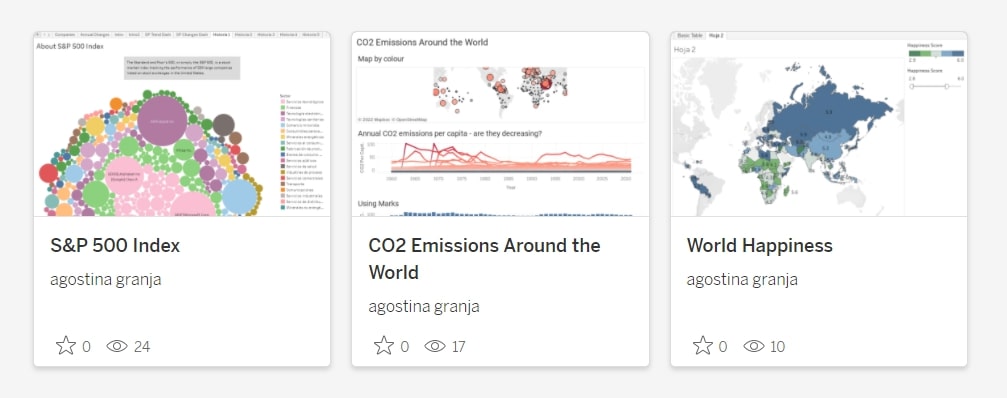 This is my Tableau Public profile. There, you can find some of my favorite dashboards. I accomplished some of them as exercises for the Google Data Analyst certificate and others as part of independent projects.